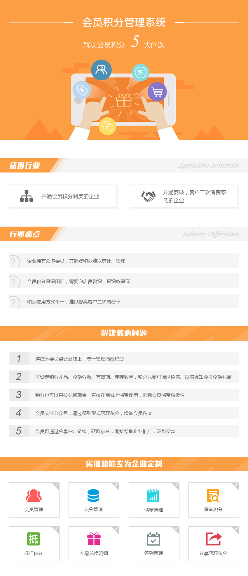 会员管理、积分管理、消费明细、查询积分、抵扣积分、礼品兑换明细、签到管理、分享获取积分